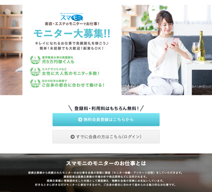 携企業様から依頼されたモニターのお仕事を会員の皆様に調査(モニター体験・アンケート回答)をしていただきます。調査結果は提携企業様の市場分析や商品開発などに活用されます。提携企業様に情報提供をした対価として調査謝礼・報酬を会員の皆様にお支払いしています。好きなときに好きなだけモニターに参加できるので、ご自身の都合に合わせて進められる魅力的なお仕事です。