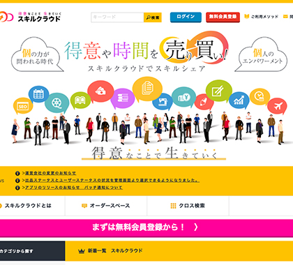 スキルクラウドとは、個人が保有するスキルやノウハウをオンライン、オフラインを問わず提供、購入できるクラウドソーシングプラットフォームです。1億総ユーザーがすでに保有しているノウハウやスキル、そしてまだ自分でも気づいていない強み それを欲しているユーザーとつなぎ合わせることで、提供者のエンパワーメントを促進し、購入者はそれを手軽に安価に利用することができます。